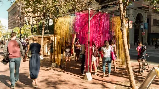 Glimmer was commissioned for the Market Street Prototyping Festival, a design competition jointly sponsored by Yerba Buena Center for the Arts and San Francisco Planning Department that challenged artists and architects to reimagine public infrastructure along the city’s primary urban thoroughfare. For four days in October 2016, Glimmer was installed on Market Street in San Francisco's Financial District, where thousands of pedestrians interacted with the bright, colorful, and dynamic addition to the streetscape. The structure attracted people of all ages, sizes, backgrounds, and dispositions to depart from their conventional day-to-day sidewalk routine and engage in a moment of light playfulness that is not commonly seen in the urban realm.